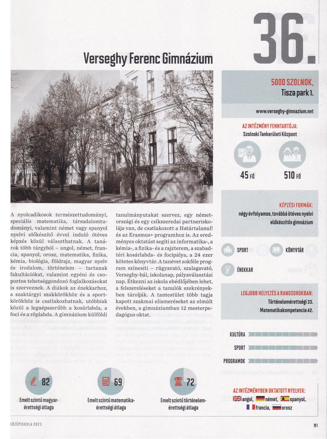 A 100-as listában a vidéki gimnáziumok rangsorában a Verseghy Ferenc Gimnázium 16., Jász–Nagykun–Szolnok megyében pedig miénk az 1. hely.